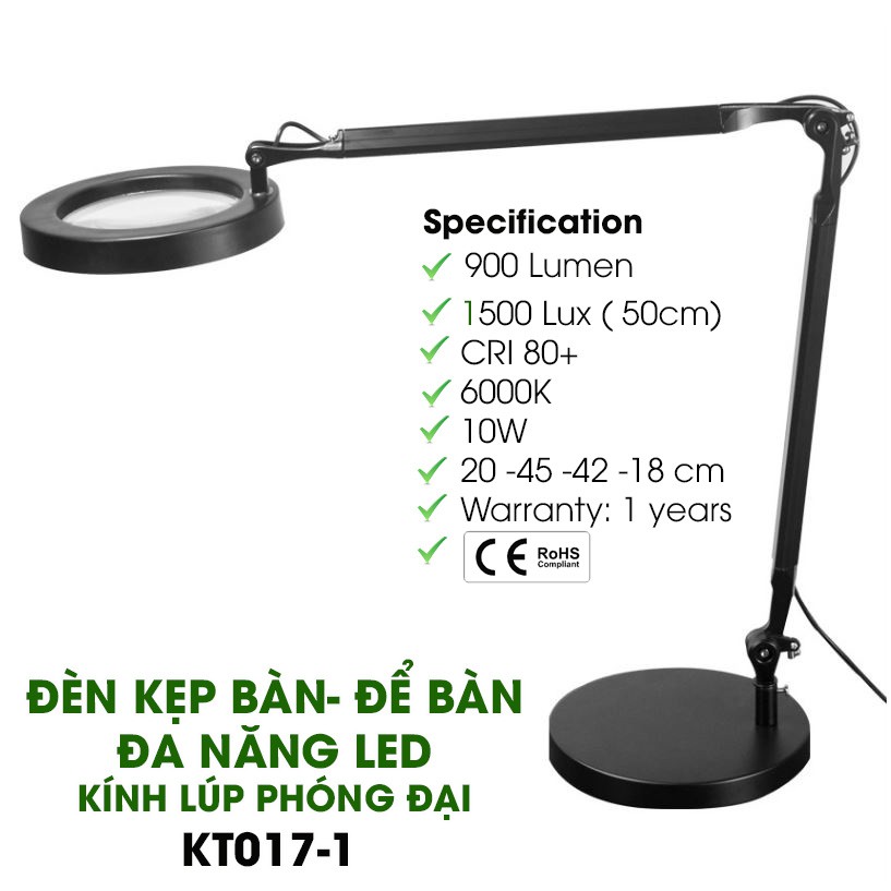 Đèn Bàn & Kẹp Đa Năng LED + Kính Lúp To KT017-1. Cao - To - Sáng, Thân Hợp Kim Nhôm Sơn Tĩnh Điện Chắc Chắn. free ship